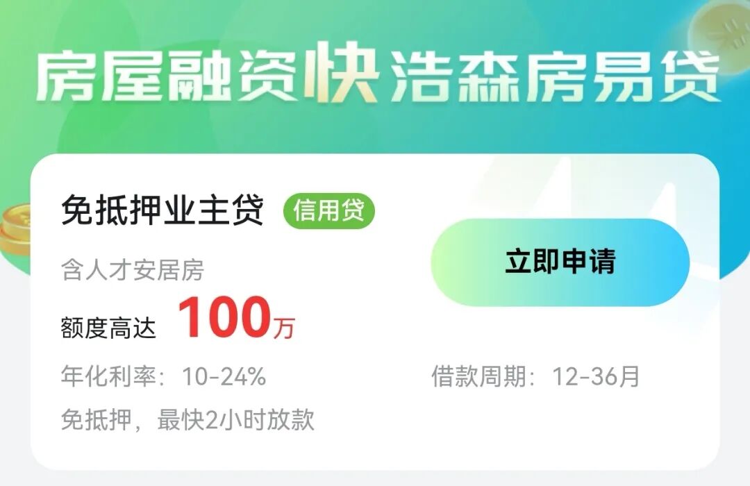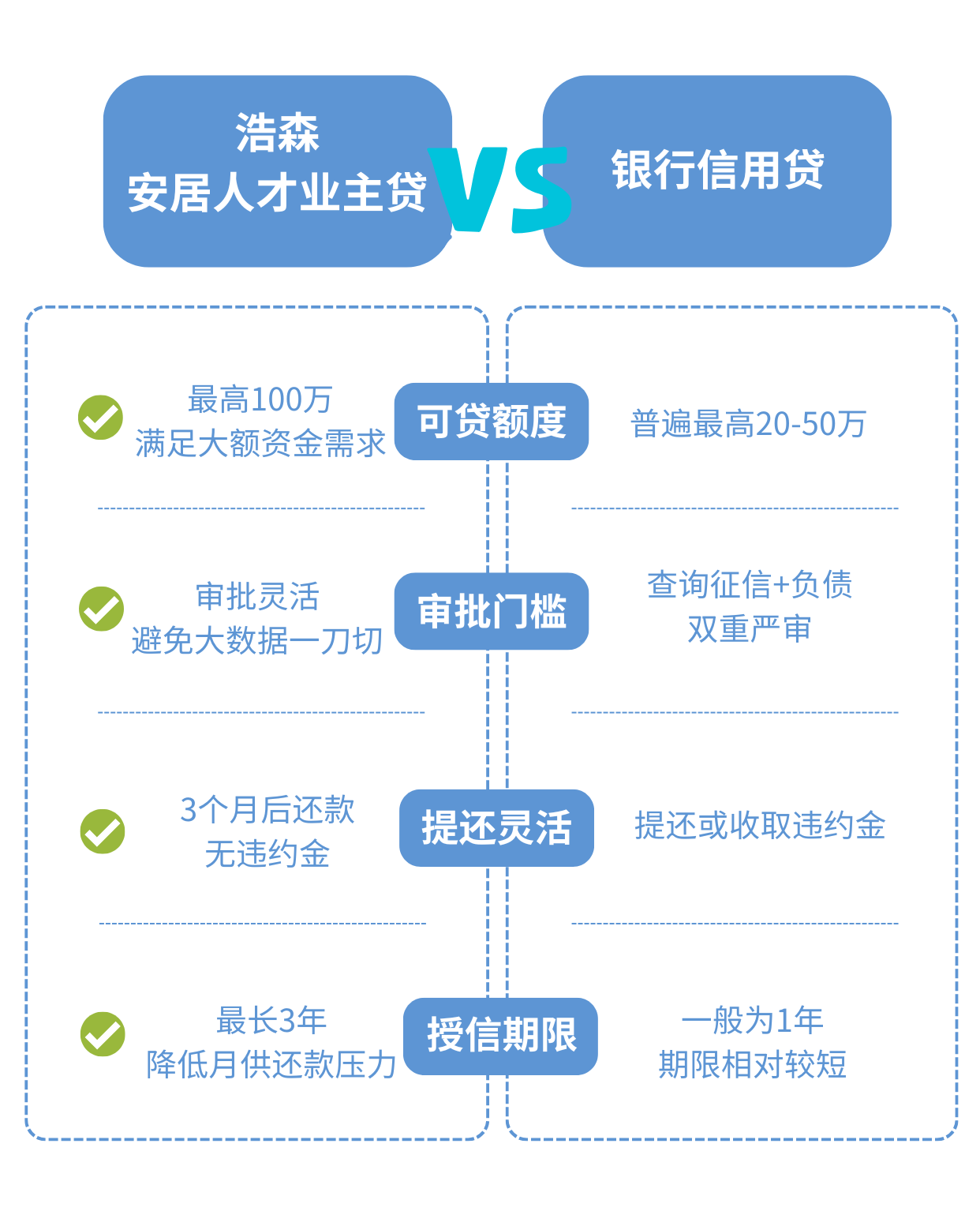 针对人才房限售期内"有价难贷"的空白市场,浩森推出「安居人才业主贷」。无需抵押,只要您是安居人才类住房业主即可申请。